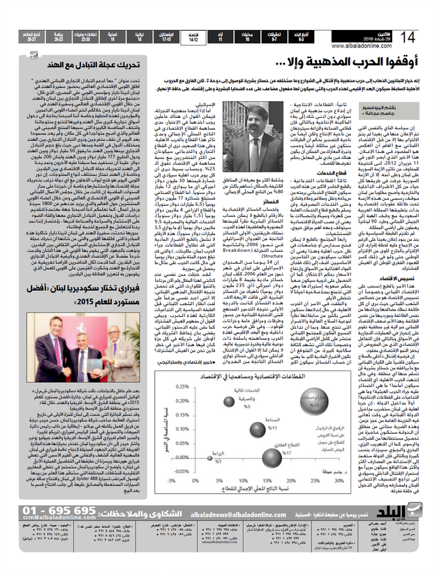 إنه خيار اللبنانيين الذهاب إلى حرب مذهبية والإقتتال في الشوارع وما ستُخلّفه من خسائر بشرية للوصول إلى دوحة 2. لكن الفارق مع الحروب الأهلية السابقة سيكون البعد الإقليمي لهذه الحرب والتي سيكون لها مفعول مضاعف على عدد الضحايا البشرية وعلى إقتصاد على حافة الإنهيار. إن سياسة النأي بالنفس التي تمّ الإعلان عنها في بعبدا لم يتمّ الإلتزام بها إلا من قبل الإقتصاد اللبناني مع العلم أن العكس هو المقصود في هذا الإعلان. هذا الأخير الذي أبصر النور في 11 حزيران 2012، أتى كنتيجة للمخاوف من تأثير الأزمة السورية على لبنان وعلى أمنه. إلا أن الأزمة السورية جرفت في طريقها كل حياد من كل الأطراف الداخلية والخارجية وأصبح المطلوب من لبنان موقف رسمي من هذه الأزمة تحت طائلة عقوبات إقتصادية بدأت بتطبيقها المملكة العربية السعودية مع وقف الهبة إلى الجيش اللبناني وطرد 90 لبنانياً يعملون على أراضي المملكة.لم تلتزم الطبقة السياسية بأي بند من بنود إعلان بعبدا على الرغم من الإجماع عليه لحظة إقراره، لإن الإلتزام بالخارج أقوى من الإلتزام الوطني حتى ولو في ذلك كسر للعمود الفقري للوطن أي العيش المُشترك.هذا الأمر بالطبع إنسحب على الإقتصاد اللبناني وخصوصاً أن تسييس الإقتصاد هو من خصائص الشعب اللبناني حيث نرى أن كل طائفة تملك مصالحها وزبائنها من نفس الطائفة ومورديها من نفس الطائفة. وهذا الأمر ضعف الإقتصاد اللبناني عبر آلية غير منطقية تقوم على إنحياز في العمليات التجارية في الأسواق وبالتالي فإن التفاعل الإقتصادي الذي من المفروض أن يُحفز النمو الإقتصادي مفقود.إن فرضية إقتتال داخلي بالسلاح سيكون قاضياً على الكيان اللبناني مع ما يرافقه من خسائر بشرية لن تسلم منها أي منطقة. وفي حال إنتهت الحرب الأهلية، أي إقتصاد سيكون أمامنا؟ ما هي الخسائر عليه جراء الحرب العبثية؟ وما هي التداعيات على القطاعات الإنتاجية؟أولاً مداخيل الدولة : إن حرب أهلية في لبنان ستضرب مداخيل الدولة اللبنانية في وقت تُعاني فيه الخزينة العامة من عجز مُزمن. وهذه الضربة ستأتي من منطلق أن الدولة ستكون عاجزة عن تحصيل مستحقاتها من الضرائب والرسوم. كما أن التهريب البرّي، البحري والجوّي سيزداد بنسب كبيرة وبالتالي فإن الدولة ستعمد إلى الإستيدان من المصارف أكثر وأكثر. هذا الواقع سيكون مريراً مع إستمرار الإقتتال الداخلي وسيؤدي إلى تراجع التصنيف الإئتماني للبنان ولمصارفه وبالتالي الدخول في حلقة مُفرغة.ثانياً: القطاعات الإنتاجية : إن إندلاع حرب مذهبية في لبنان ستؤدي دون أدنى شك إلى بطئ الماكينة الإنتاجية وبالتالي فإن قطاع الصناعة والزراعة سيترجعان من ناحية الإنتاج ولكن أيضاً من ناحية التصدير بحكم أن الطرقات ستكون غير سالكة. أيضاً وبحسب وتيرة المعارك من المُمكن أن يكون هناك ضرر مادي على المعامل بحكم تعرضها للقصف.ثالثاً القطاعات الخدماتية : بالطبع الخاسر الأكبر من هذه الحرب سيكون القطاع الخدماتي برمته من سياحة ونقل ومطاعم وملاهي وفنادق وحتى الخدمات المصرفية. ولن يسلم بالطبع قطاع الخدمات العامة من كهرباء ومياه وإتصالات ما يعني أن عصب الحياة الإقتصادية سيتوقف ومعه أهم مرفق حيوي، المُستشفيات.رابعاً المجتمع: بالطبع لا يُمكن فتح مدارس أو جامعات في ظل حرب أهلية وهذا يعني أن الطلاب سيكونوا من الخاسرين الأساسيين. أضف إلى ذلك فقدان المواد الغذائية من الأسواق وإرتفاع الأسعار بحكم الإحتكار. كما أن الحصول على أدوية سيكون صعباً بحكم صعوبة إستيرادها وهي التي تتمتع بمدة صلاحية أحياناً لا تتخطى الأيام. والمُلفت في الأمر أن الحرب الأهلية، في حال إندلاعها، ستكون أقسى بكثير من سابقاتها نظراً لنوعية السلاح العالية والأضرار التي تنتج عنها. وبما أن تداخل النسيج المُكون للمجتمع اللبناني مُنتشر على كامل الأراضي اللبنانية وخصوصاً تلك التي تشهد كثافة سكانية كبيرة، من المُتوقع أن تكون الأضرار المادية أكبر. ما يعني أن حساب الخسائر سيكون أكبر وشامل أكثر مع م