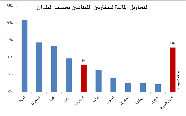 وتُشكل الدول العربية مُجتمعة 13% من مُجمل تحاويل المغتربين اللبنانيين إلى لبنان أيْ 975 مليون دولار أميركي. ما يعني أنّ لبنان قد يخسر مليار دولار في حال تمّ صرف كلّ العمال اللبنانين من الدول العربية أو تمّ حظر التحاويل إلى لبنان عبر عقوبات على مصرف لبنان (أسوء السيناريوهات).
