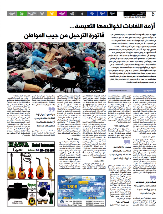 فبعدما أصبح خيار ترحيل النفايات امراً واقعاً “سيتم الاتفاق عليه بالإجماع” في جلسة مجلس الوزراء الاثنين المقبل، بُعيد أن ذلل الرئيس تمام سلام آخر عقباتها مع رئيس مجلس النواب نبيه بري في اجتماع مفاجئ يوم أمس، وضعت ازمة النفايات على سكة الترحيل التي تقدّر كلفتها اليومية بـ”مليون ونصف المليون دولار”. أما المفاجئ أن من دفع وما زال يدفع فاتورة اوساخها، انبعاثاتها السامة، وامراضها… هو ايضا سيدفع كلفة ترحيلها من جيبه. ومَن غيره ذلك المواطن الذي يحصد اليوم في مستوعبات النفايات ما زرعه في صناديق الاقتراع، اذ سيضاف 3000 ليرة لبنانية الى سعر صفيحة البنزين في لبنان كضريبة اضافية لسد عجز يصل الى 4 مليار دولار آخر العام الحالي بغض النظر عن النصف مليار دولار كلفة تصدير النفايات.