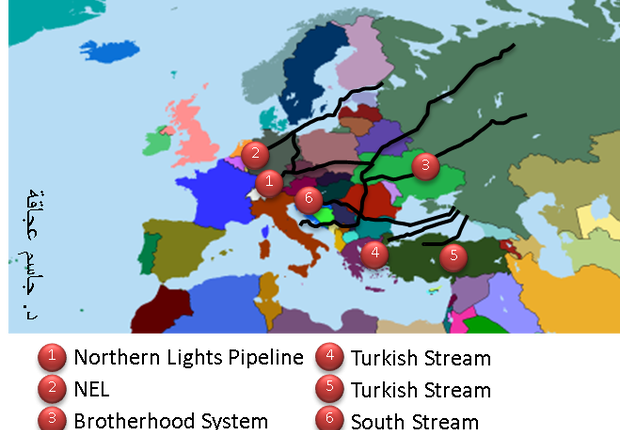 وخطة بوتين هي بمنع أي تصدير للغاز من الشرق الأوسط إلى أوروبا لكي يتسنّى لروسيا السيطرة على السوق الأوروبي. وكانت روسيا قد وقّعت مع تركيا عقد لتمرير أنبوب غاز من روسيا عبر البحر الأسود إلى الأراضي التركية ومن ثمّ إلى أوروبا وذلك لتفادي أوكرانيا إذا أمكن. وبالفعل تمّ بدء العمل بهذا الأنبوب بعدما تمّ إلغاء المشروع القديم والذي ينص على تمرير هذا الأنبوب مباشرة عبر بلغاريا. وهدف روسيا (كما يُظهره الرسم البياني) إيصال الغاز إلى أوروبا عبر طرق عدة لكي لا تكون روسيا رهينة سياسة بلد معين مثل أوكرانيا.