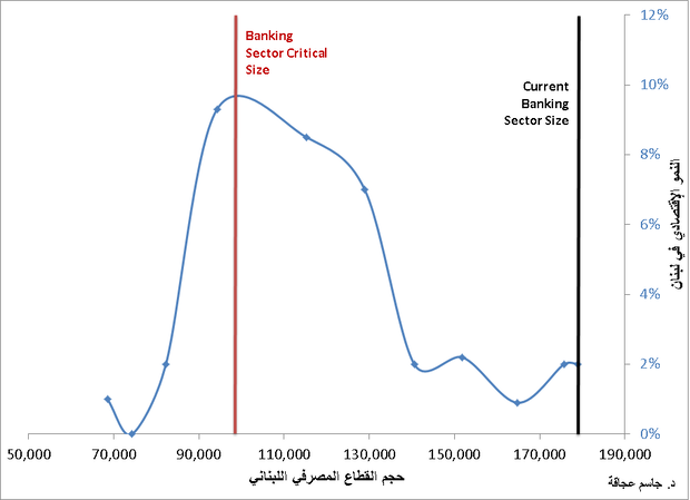 هنا يظهر إلى العلن عمق المُشكلة التي بدأت تفرضها ودائع بهذا الحجم. فدور القطاع المصرفي هو تمويل الاقتصاد بشقيه الإستثمار والإستهلاك والمعروف أن لبنان يُمّولإقتصاده عبر القطاع المصرفي (Banking Sector Dominated) على عكس الإقتصادات المُتطورة الحرّة التي تمُوّل إقتصاداتها منالأسواق المالية (Financial Market Dominated). هذا يعني أن كل زيادة في الدخل الفردي تدفع بإتجاه التمّويل من الأسواقالمالية. والعكس بالعكس. بمعنى أخر كلما زاد الدخل الفردي ، زاد طلب الأسر والشركات على الخدمات المُتطورة التي تؤمنها الأسواق كشركات التأمين وصناديق الإئتمانالتي تلعب دوراً مهماً في إقتصادات الدول الكبرى. وبحكم هيكلية الاقتصاد اللبنانيوالإطار الأمني والسياسي الذي يعيشه لبنان، نرى أن الاقتصاد لا يُموّل من الأسواقالمالية بل من القطاع المصرفي الذي وكما سبق الذكر يتشدّد في تمويل الإستثمارويُفرط في تويل الإستهلاك. كما أن حاجة هذا الاقتصاد إلى يدّ عاملة غير موجودة بحكم غياب الإستثمارات والفائض منالي العاملة الأجنبية. هذا الأمر الذي صاغه “كنت” (Kuntet al.2011) بطريقة واضحة، ينص على “أن إستمرارالنمو في إقتصاد معين، يجعل الإنتاج يتعلق بنسبة أقل بتقلبات القطاع المصرفيوبنسبة أكبر بالأسواق المالية”. ويبقى السؤال عن مدّى تأثير حجم القطاعالمصرفي اللبناني على النمو؟ على هذا الصعيد، يقول (Kharroubi& Cecchetti 2012) أن علاقة الإنتاج بحجم القطاع المصرفي هيعلاقة بشكل حرف U مقلوب أي أن حجم قطاع مصرف كبير أو صغير له تأثيرسلبي على نمو الإنتاج. ويُبرر الباحث هذا الأمر بأن تطور القطاع المصرفي يدفعالاقتصاد إلى النمو في بلد قطاعه المصرفي غير متطور ، لكن التأثير يُصبح سلباًعندما يتخطى حجم القطاع المصرفي حجماً معيناً(CriticalSize). وكما يتضح لنا من خلال دراسة الأرقام، نرىأن 100 مليار دولار أميركي هو الحجم الأمثل لنمو إقتصادي عالٍ، لكن الحجم الحاليللقطاع المصرفي أصبح يوازي الـ 180 مليار دولار ما يعني أن هناك فائض مالي بـ 80مليار دولار أميركي يجب على المصارف توظيفها في مكان مُعين.