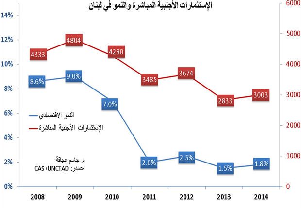 يُعَدّ رأس المال بهدف الإستثمار عنصراً أساسيّاً للنموّ، فالعلاقة بين النموّ الاقتصادي وحجم الإستثمار هي علاقة تمّ أثباتها عبر الأرقام في كلّ الاقتصادات كما في الاقتصاد اللبناني. وتُظهر الأرقام أنّ الإستثمارات الأجنبية المُباشرة في الأعوام 2008 إلى 2014 دفعت بالنموّ إلى المنحنى نفسه، ففي كلّ مرة زادت الإستثمارات زاد معها النموّ والعكس بالعكس.