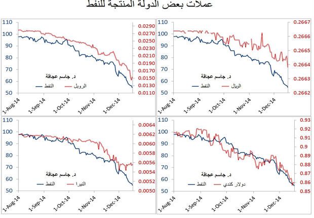 الدول المُتضررة من إنخفاض سعر النفط هي الدول المُنتجة له وعلى رأسها روسيا، المملكة العربية السعودية، الولايات المُتحدة الأميركية، الصين، كندا، إيران، العراق، الإمارات العربية المتحدة، فنزويلا، المكسيك، الكويت، البرازيل، النورويج، الجزائر، أنغولا، كازاخستان، قطر، بريطانيا وغيرها من الدول. يُترجم هذا الضرر بتدنّي قيمة العملة الوطنية مقابل الدولار الأميركي كما يُظهره الرسم البياني حيث تتبع أسعار العملات منحنى أسعار النفط.