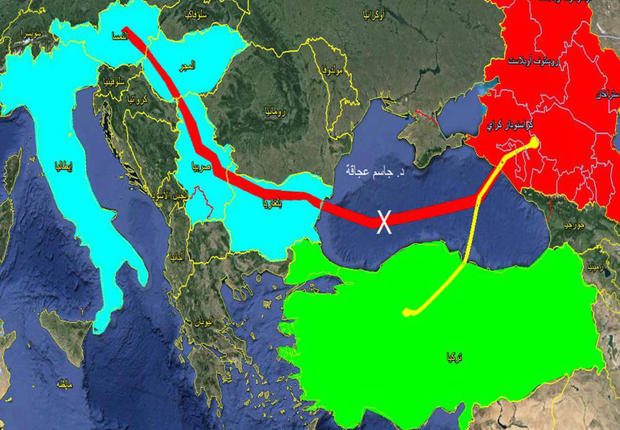لذا عمدت روسيا إلى لعب ورقة إقتصادية وإستراتيجية بإمتياز عبر وقف مشروع السيل الجنوبي (الخط الأحمر على الرسم) وإستبداله بخط أنابيب إلى تركيا وبالتحديد أنقرة (الخط الأصفر العريض على الرسم).