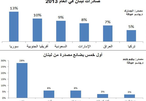 وبحسب الجمارك إحتلت سوريا المرتبة الأولى في صادرات لبنان (13% من أصل 7.25 مليارات دولار) بعدما كانت في المرتبة الخامسة في لائحة الشركاء التجاريين للبنان. وأهم الصادرات إلى سوريا الحيوانات، المشروبات والتبغ ومعظمها من البقاع والجنوب.