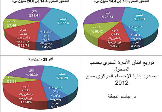 وبالنظر إلى توزيع الإنفاق السنوي للأسر اللبنانية بحسب المدخول، نرى أنّ التعليم يستهلك قسماً كبيراً من مداخيل الأسر (30%). وبحسب تصريحات المدارس الخاصة، فإنّ إقرار سلسلة الرتب والرواتب سيؤدي إلى زيادة بنسبة 27% على الأقساط هذا العام. وتقديراتنا الأولية تنصّ على أنّ إقرار الزيادة 1% على الضريبة على القيمة المُضافة سيؤدّي إلى زيادة الأسعار بمعدل وسطي للأسعار يتجاوز الـ 10% ما سيكون كارثياً على النموّ الاقتصادي.