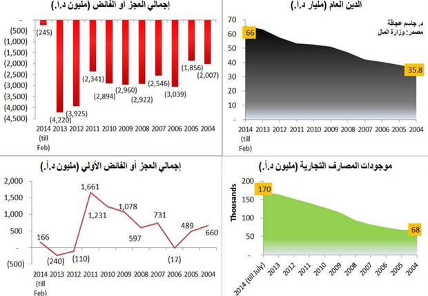 وتُشير الأرقام إلى أنّ العجز في الميزانية العامة تخطى الستة آلاف مليار ليرة لبنانية، حتى إن وزير المال صرّح بأنّ العجز في موازنة العام 2014 سيتخطّى السبعة آلاف مليار ليرة لبنانية. وهذا العجز يزيد من قيمة الدين العام الذي إرتفع من 53.8 مليار دولار في العام 2004 إلى ما يزيد عن 63 مليار دولار أي بزيادة 77% في فترة عشر سنوات.