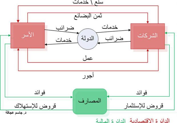 هذه الدائرة تُسمّى الدائرة الاقتصادية والتي تسمح بخلق الثروات وتتمثل بفرق سعر بيع السلع وكلفة تصنيعها والتي تُسمّى بالربح. ولكي تتمّ عملية البيع ينبغي توفّر الشرطين التاليين: أن تتقاضى الأُسر أجراً لكي تستطيع شراء السلع (الإستهلاك)؛ وأن تتوفر الأموال للشركات لكي تستطيع تصنيع السلع (الإستثمار).