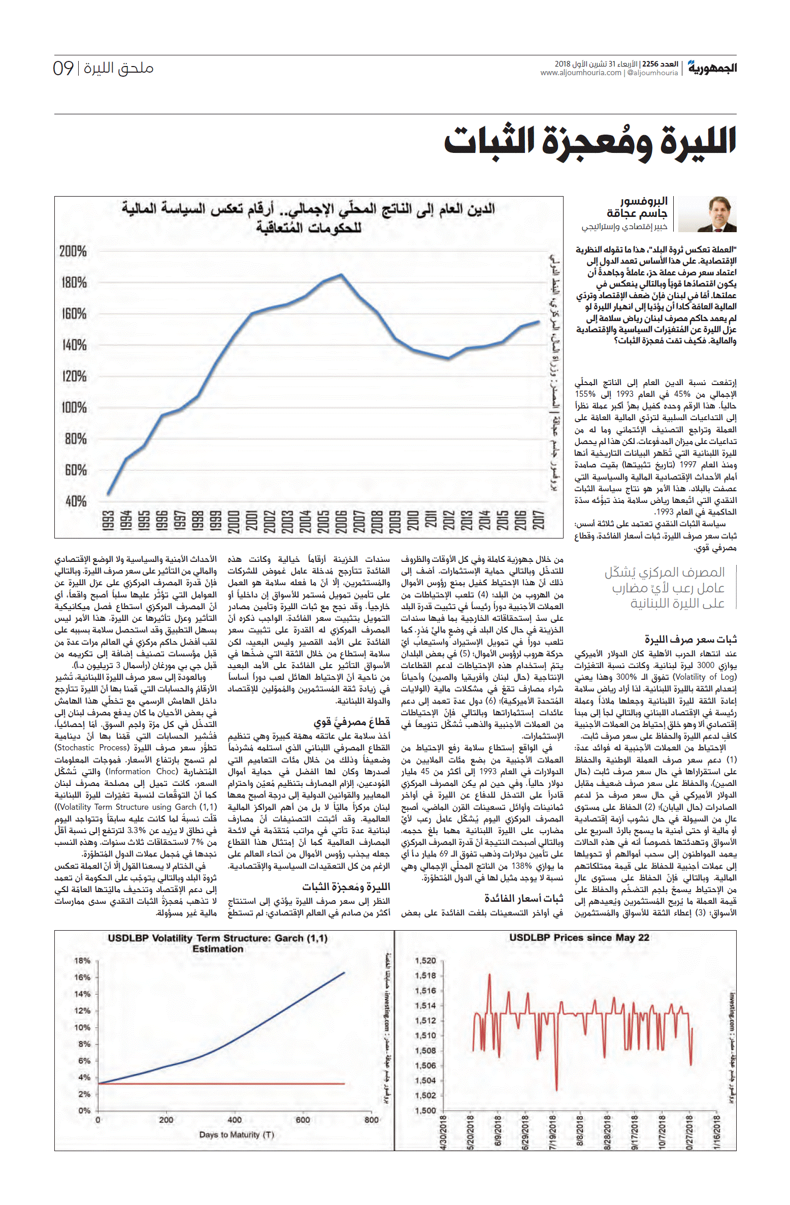 “العملة تعكس ثروة البلد”، هذا ما تقوله النظرية الإقتصادية. على هذا الأساس تعمد الدول إلى اعتماد سعر صرف عملة حرّ، عاملةً وجاهدةً أن يكون اقتصادُها قويّاً وبالتالي ينعكس في عملتها. أمّا في لبنان فإنّ ضعف الإقتصاد وتردّي المالية العامّة كادا أن يؤدّيا إلى انهيار الليرة لو لم يعمد حاكم مصرف لبنان رياض سلامة إلى عزل الليرة عن المُتغيّرات السياسية والإقتصادية والمالية. فكيف تمّت مُعجزة الثبات؟إرتفعت نسبة الدين العام إلى الناتج المحلّي الإجمالي من 45% في العام 1993 إلى 155% حالياً. هذا الرقم وحده كفيل بهزّ أكبر عملة نظراً إلى التداعيات السلبية لتردّي المالية العامّة على العملة وتراجع التصنيف الإئتماني وما له من تداعيات على ميزان المدفوعات.