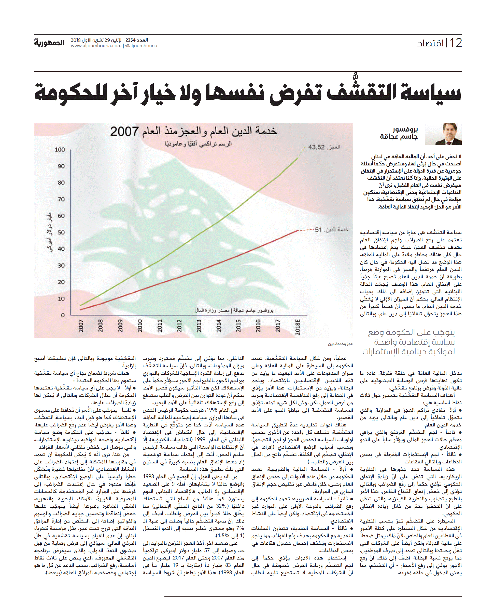 على صعيد آخر، أخذ العجز المُزمن بالتزايد إلى حد وصوله إلى 57 مليار دولار أميركي تراكمياً منذ العام 2007 وحتى العام 2017، ليصبح الدين العام 83 مليار د.أ (مقارنة بـ 19 مليار د.أ في العام 1998). هذا الأمر يُظهر أنّ شروط السياسة التقشفية موجودة وبالتالي فإن تطبيقها أصبح إلزامياً.