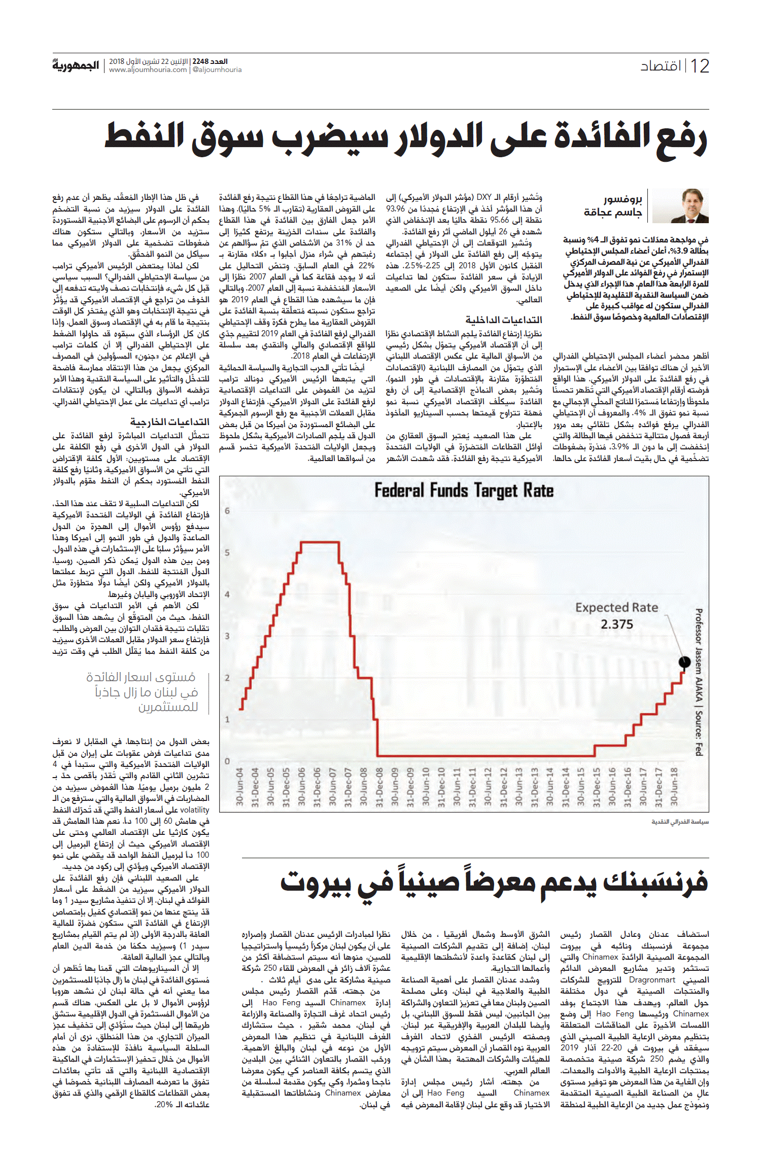 وتُشير التوقعات إلى أن الإحتياطي الفدرالي يتوجّه إلى رفع الفائدة على الدولار في إجتماعه المُقبل كانون الأول 2018 إلى 2.25-2.5%. هذه الزيادة في سعر الفائدة ستكون لها تداعيات داخل السوق الأميركي ولكن أيضًا على الصعيد العالمي.