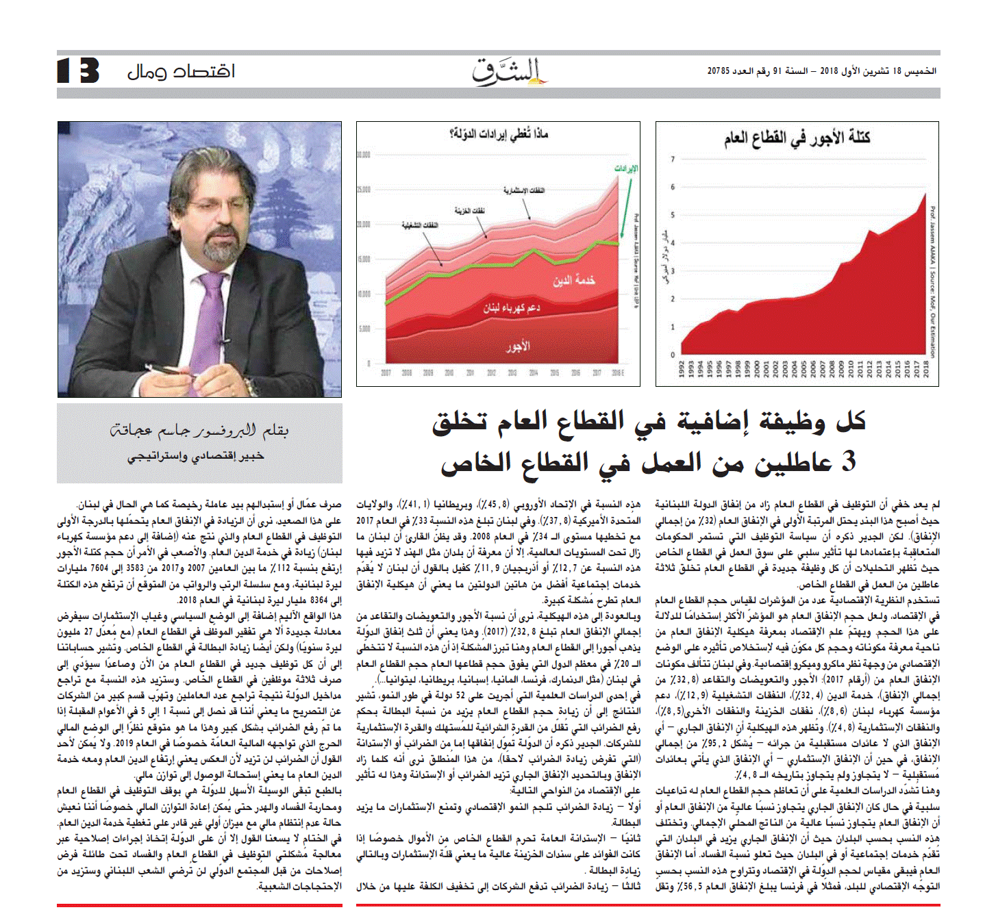 على هذا الصعيد، نرى أن الزيادة في الإنفاق العام يتحمّلها بالدرجة الأولى التوظيف في القطاع العام والذي نتج عنه (إضافة إلى دعم مؤسسة كهرباء لبنان) زيادة في خدمة الدين العام. والأصعب في الأمر أن حجم كتلة الأجور إرتفع بنسبة 112% ما بين العامين 2007 و2017 من 3583 إلى 7604 مليارات ليرة لبنانية، ومع سلسلة الرتب والرواتب من المتوقّع أن ترتفع هذه الكتلة إلى 8364 مليار ليرة لبنانية في العام 2018.