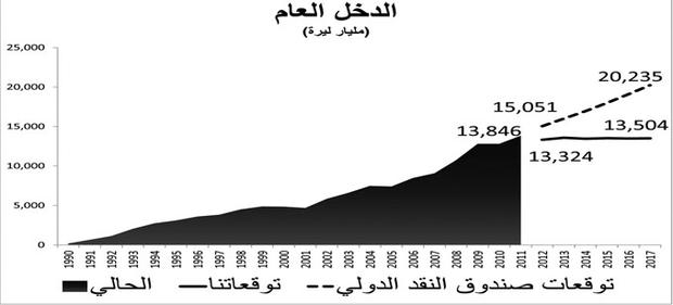ومع كل الغموض الذي يعتري مستقبل الأزمة السورية ومدتها، نرى أن المسؤولين يعيشون في كوكب أخر. فمشروع موازنة 2012 ومشروع موازنة 2013 أكبر دليل على غياب المسؤولين. لكن هذا الغياب إصطدم بمعضلة سلسلة الرتب والرواتب التي أثبتت عدم قدرة أهل السلطة وتسرعهم في بعض الأحيان في إتخاذ القرارات الصحيحة. واقع لبنان في نهاية 2012 هو الآتي: – دين عام يفوق الـ57 مليار دولار – نمو لا يزيد عن 0.5% إذا ما وُجد – تضخم يفوق الـ 14% – عجز في الميزانية العامة يفوق الـ 13000 مليار ليرة – بطالة تُقدر بـ 30% والتوقعات أسوأ من ذلك (أنظر الى الرسم) : – الدين العام: في غياب أي تغيرات ماكرو إقتصادية و/أو إصلاحات، نتوقع أن يفوق الدين العام الـ 86 مليار دولار في الـعام 2017، في حين يتوقع صندوق النقد الدولي أن يكون 77 مليار دولار. – الناتج المحلي الإجمالي: نتوقع أن ينخفض الناتج المحلي الإجمالي الى 42000 مليار ليرة بنهاية 2017 في حين يتوقع صندوق النقد الدولي إرتفاع الناتج المحلي الإجمالي سنوياً حتى 2017. ولا نفهم المُعطيات وراء هذه التوقعات مع العلم أن الصندوق توقع نمواً للبنان في 2011 و2012 بنسبة 4% وهذا ما لم يحصل ! الميزان الهيكلي العام (General Structural Balance): الذي هو الميزان للموازنة مصحح من كل العوامل الهيكلية وخصوصاً الدورات الإقتصادية. ونرى أن العجز سيفوق ما يتوقعه صندوق النقد الدولي ليبلغ 16358 مليار ليرة لبنانية بحلول نهاية 2017 مقابل 9855 مليار ليرة لصندوق النقد الدولي. الدخل العام: يرى صندوق النقد الدولي أن الدخل العام سيزيد سنوياً ليبلغ 20235 مليار ليرة في حين نرى أنه سينخفص الى 13504 مليار ليرة في نهاية 2017. من المفروض أن يعكس مشروع موازنة 2012 ومشروع موازنة 2013 البيان الوزاري الذي أُعطيت من خلاله الثقة للحكومة. وبالنظر الى هذه المشاريع نرى أنها لا تمت بصلة الى البيان الوزاري ولا تأخذ بالإعتبار المعطيات الإقليمية والمحلية وتُصِّر على توقعات نمو 3% للعام 2013. كما وأن هذه المشاريع لا تحتوي على أي خطط تقشف لا بل على العكس، نرى أن الحكومة سخية في كل ما يخص الأجور وتقوم بعمليات حسابية بحتة. وإذا ما تبعنا المبدأ الحسابي لهذه المشاريع، نسأل الحكومة كيف يُمكن وضع مشروع موازنة بدون أن يكون هناك قطع حساب للسنين الماضية؟ أوليس بإعتمادنا على قطع حساب السنين السابقة نستطيع وضع مشروع موازنة؟ ويبقى السؤال الأساسي: كيف تستطيع الحكومة سد العجز الناتج عن 2012 والذي يبلغ 10000 مليار ليرة (6000 مليار لخدمة الدين العام، 1500 مليار ليرة للكهرباء، 2500 مليار ليرة لسلسلة الرتب والرواتب) إضافة الى إستحقاقات الإصدارات التي ستأتي في هذا العام 2013 (1,525 مليار دولار) وخدمة الدين العام والكهرباء وغيرها لـ2013 ؟ من المؤكد أن عدد مصادر التمويل محدودة وتكمن في النقاط التالية: – إصدارات جديدة: والتي بحسب رأينا ستزيد خدمة الدين العام كما والفجوة بين أسعار الفائدة والنمو الحقيقي، وبالتالي الدين العام وبالتالي ضرب الليرة اللبنانية. – ضرائب جديدة: بغض النظر عن هذه الضرائب، فإنها ستقتل النمو. إذ من المعروف أنه في الأوقات العصيبة يجب إتباع سياسة تمدُّدية (Expansionist) لتحفيز النمو. – إتباع سياسة تقشفية تسمح بتوفير قسم من هذا المبلغ وهذا ما لم يرد في مشروع الموازنة. في النتيجة، اذا كانت الحكومة تبحث فعلا عن الانقاذ عليها اتباع الخطوات التالية: – وضع مشروع موازنة واقعي يأخذ بالإعتبار واقع لبنان المحلي والإقليمي. – وضع خطة تقشفية تبدأ بلجم الهدر والأجور غير الواقعية وجباية مستحقات الدولة من ضرائب وفواتير غير مدفوعة (3 مليار دولار) – وضع ضرائب على الأملاك البحرية والتي توازي على الأقل الضريبة على القيمة المُضافة – فرض ضرائب على الشقق الشاغرة والتي ستدر مبالغ كبيرة على الخزينة (بيروت وحدها تحتوي على 45000 شقة شاغرة) – فرض ضرائب على المولدات الكهربائية والتي تحرم خزينة الدولة من 128 مليون دولار سنوياً. – تخصيص إدارة عدد من المرافئ العامة. – بدء الشراكة الفعلية مع القطاع الخاص. – دفع المصارف الى تم