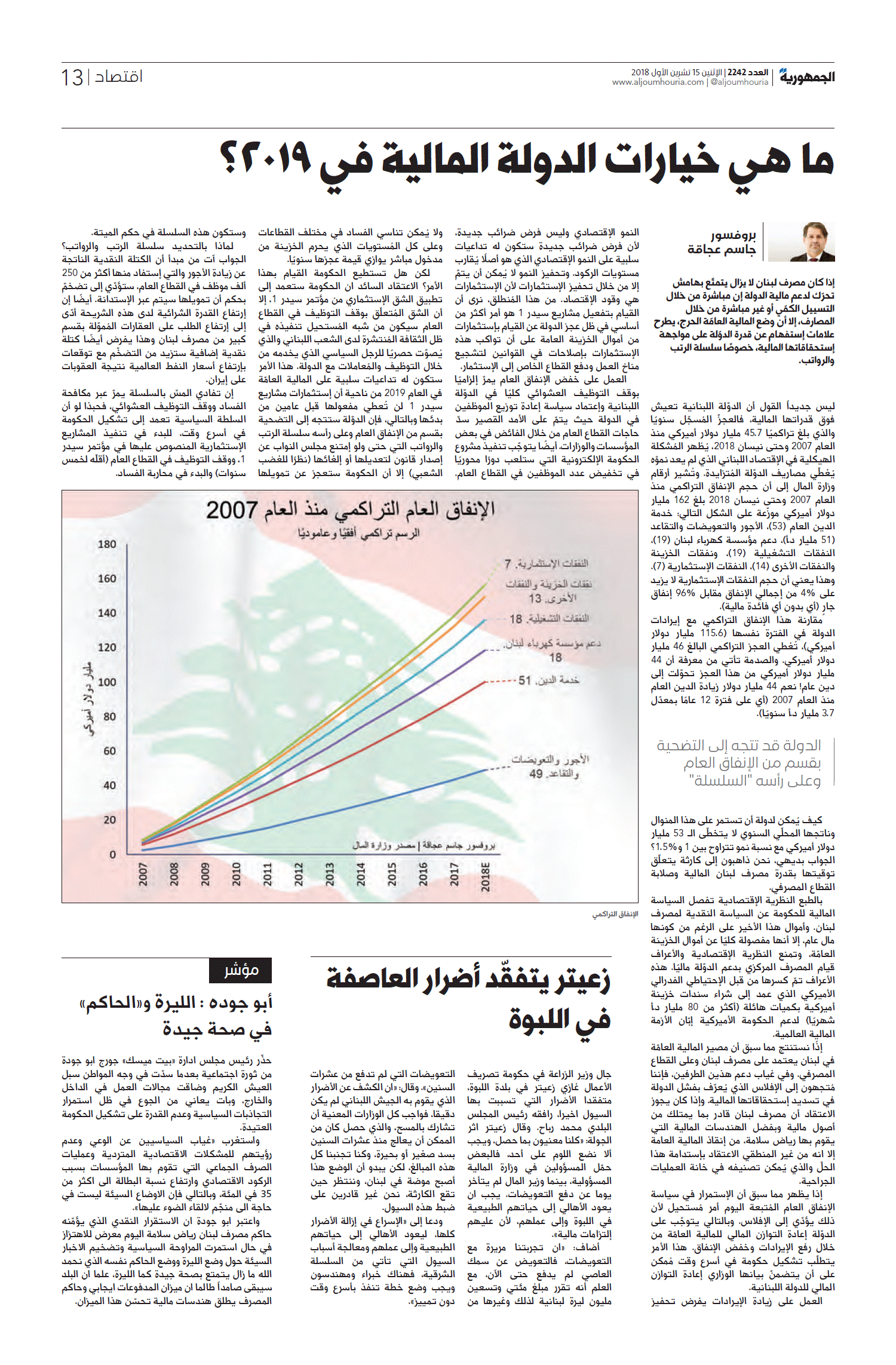 لكن هل تستطيع الحكومة القيام بهذا الأمر؟ الاعتقاد السائد ان الحكومة ستعمد إلى تطبيق الشق الإستثماري من مؤتمر سيدر 1، إلا أن الشق المُتعلّق بوقف التوظيف في القطاع العام سيكون من شبه المُستحيل تنفيذه في ظل الثقافة المُنتشرة لدى الشعب اللبناني والذي يُصوّت حصريًا للرجل السياسي الذي يخدمه من خلال التوظيف والمُعاملات مع الدولة. هذا الأمر ستكون له تداعيات سلبية على المالية العامّة في العام 2019 من ناحية أن إستثمارات مشاريع سيدر 1 لن تُعطي مفعولها قبل عامين من بدئها وبالتالي، فإن الدوّلة ستتجه إلى التضحية بقسم من الإنفاق العام وعلى رأسه سلسلة الرتب والرواتب التي حتى ولو إمتنع مجلس النواب عن إصدار قانون لتعديلها أو إلغائها (نظرًا للغضب الشعبي) إلا أن الحكومة ستعجز عن تمويلها وستكون هذه السلسلة في حكم الميتة.