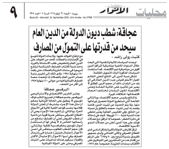 ويقول عجاقة للانوار: هذه التداعيات ستتغلغل في الماكينة الإقتصادية، والمنظومة المالية بحسب الآلية التالية: سيتم شطب الديون من رأسمال المصارف وهذا يعني أن حجم القطاع المصرفي سينخفض بنفس القيمة. وبالتالي، فإن قدرة المصارف على التسليف ستنخفض حكماً عملا بمعايير بازل التي تفرض أن كل 100 د.أ مُسلّفة يجب أن يكون مقابلها 8 د.أ من رأسمال المصرف مُجمّدة في مصرف لبنان Cooke Ratio. هذا الأمر يعني أن القطاع المصرفي سيُصبح مُلزماً تطبيق سياسة إنكماش في القروض خصوصاً للقطاع الخاص ولكن أيضاً للدوّلة اللبنانية مما يؤدّي حكماً إلى تراجع النمو الإقتصادي الذي أساسه الإستثمار والإستهلاك وسيضع الدوّلة في وضع صعب من ناحية قدرتها على التموّل من القطاع المصرفي. وبما أن الدوّلة ستذهب إلى الأسواق العالمية، ستجدّ صعوبة كبيرة في الإستدانة بحكم التخبّط السياسي الهائل الذي ينعكس بشكل تلقائي على أسعار السندات.
