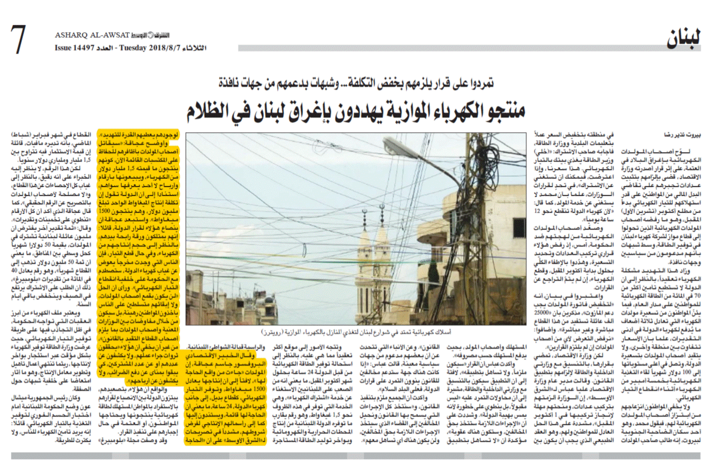 تمردوا على قرار يلزمهم بخفض التكلفة… وشبهات بدعمهم من جهات نافذة، منتجو الكهرباء الموازية يهددون بإغراق لبنان في الظلام