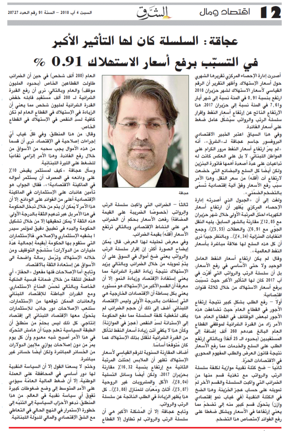 وقال: لم يكن ارتفاع أسعار النفط العامل الوحيد ولا حتى الأساسي في رفع الأسعار، بل أن سلسلة الرتب والرواتب التي أقرّت في آب 2017 كان لها التأثير الأكبر حيث تسبّبت برفع أسعار الاستهلاك من خلال ثلاثة قنوات اقتصادية: