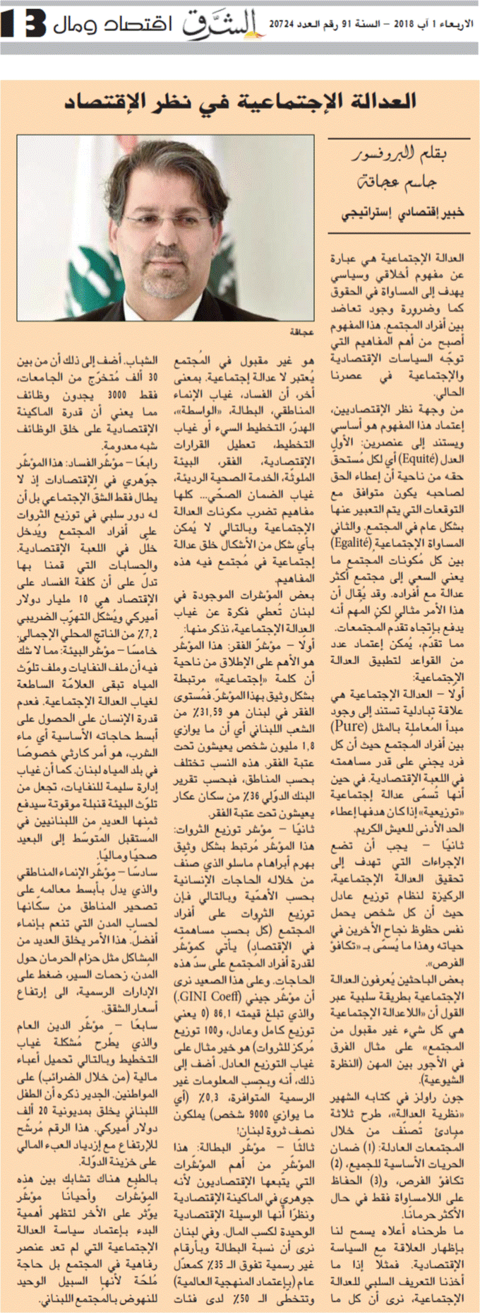 ما طرحناه أعلاه يسمح لنا بإظهار العلاقة مع السياسة الإقتصادية. فمثلًا إذا ما أخذنا التعريف السلبي للعدالة الإجتماعية، نرى أن كل ما هو غير مقبول في المُجتمع يُعتبر لا عدالة إجتماعية. بمعنى أخر، أن الفساد، غياب الإنماء المناطقي، البطالة، «الواسطة»، الهدرّ، التخطيط السيء أو غياب التخطيط، تعطيل القرارات الإقتصادية، الفقر، البيئة الملوثّة، الخدمة الصحية الرديئة، غياب الضمان الصحّي… كلها مفاهيم تضرب مكونات العدالة الإجتماعية وبالتالي لا يُمكن بأي شكل من الأشكال خلق عدالة إجتماعية في مُجتمع فيه هذه المفاهيم.