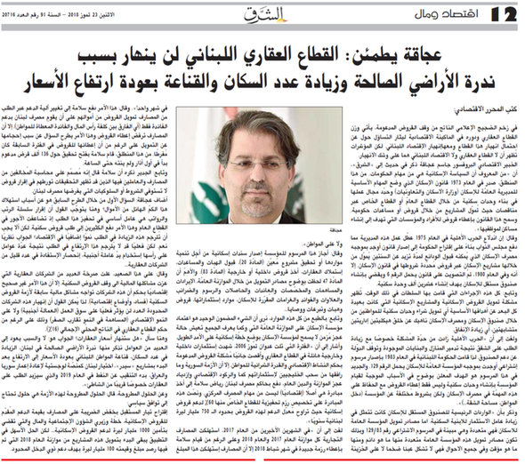 عجاقة يطمئن.. القطاع العقاري اللبناني لن ينهار بسبب ندرة الأراضي الصالحة وزيادة عدد السكان والقناعة بعودة ارتفاع الأسعار