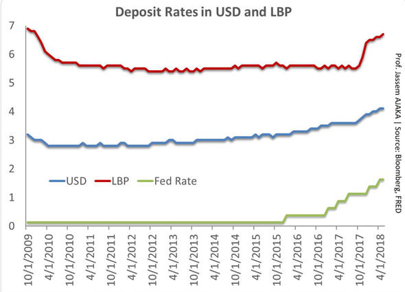 منذ العام 2008 وأسعار الفائدة في الولايات المُتحدة الأميركية مُتدنّية ونرى أن الفارق بين الفوائد على الدولار الأميركي في لبنان والولايات المُتحدة الأميركية لا يتعدّى بضعة مئات من النقاط الأساس (نتيجة تصنيف لبنان الإئتماني)، فرض معها مصرف لبنان عددا من القيود القانونية لمنع الإستفادة من أرباح بدون مخاطر (Arbitrage). وقد بدأ الإحتياطي الفديرالي الأميركي مرحلة رفع الفائدة منذ أواخر العام 2015 ليدفع بذلك العديد من دول العالم مثل الدول الخليجية وبعض الدول الأوروبية ولبنان إلى رفع الفائدة تخوّفًا من هجرة رؤوس الأموال إلى الولايات المُتحدة الأميركية. وتُظهر البيانات التاريخية أن سعر الفائدة على الليرة اللبنانية هو أعلى من سعر الفائدة على الدولار الأميركي بعدة مئات من النقاط الأساس مع تجانس شبه كامل مع أسعار الفوائد في الولايات المُتحدة الأميركية. هذا الأمر لا يمنع بالطبع تدخل مصرف لبنان لدوّزنة الفوائد في لبنان كردّة فعل على بعض الأحداث التي قد تحصل على مثال إستقالة الرئيس الحريري التي دفعت بأسعار الفائدة على الليرة اللبنانية إلى قفزة توازي 100 نقطة أساس.