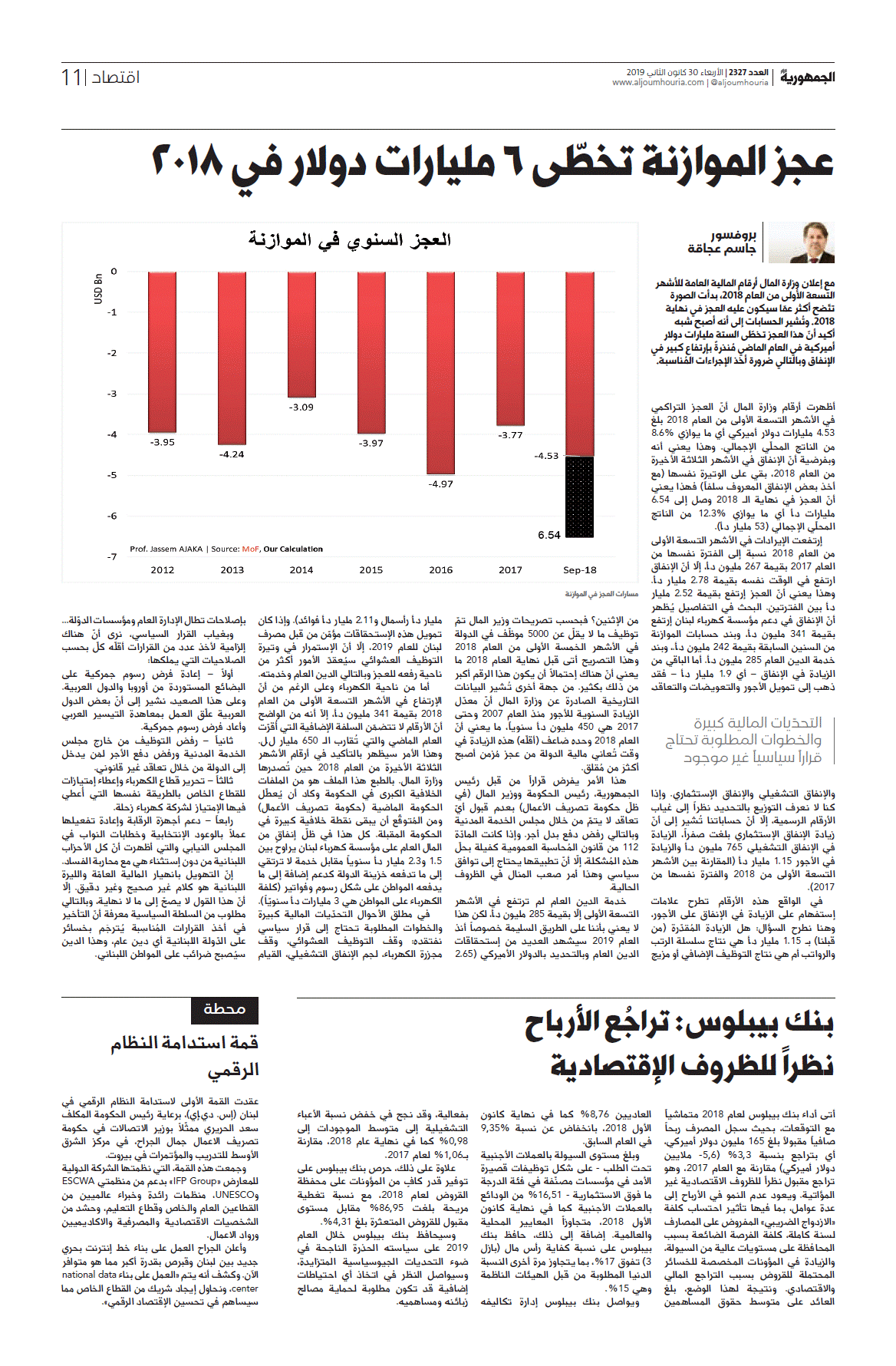 أظهرت أرقام وزارة المال أنّ العجز التراكمي في الأشهر التسعة الأولى من العام 2018 بلغ 4.53 مليارات دولار أميركي أي ما يوازي 8.6% من الناتج المحلّي الإجمالي. وهذا يعني أنه وبفرضية أنّ الإنفاق في الأشهر الثلاثة الأخيرة من العام 2018، بقي على الوتيرة نفسها (مع أخذ بعض الإنفاق المعروف سلفاً) فهذا يعني أنّ العجز في نهاية الـ 2018 وصل إلى 6.54 مليارات د.أ أي ما يوازي 12.3% من الناتج المحلّي الإجمالي (53 مليار د.أ).