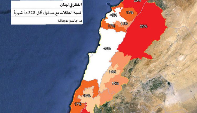 كما أنّ نسبة العائلات التي لها مدخول أقلّ من 320 د.أ شهرياً تتوزّع بين أقلّ من 5% (بيروت وجبل لبنان) إلى أكثر من 25% (عكار، الهرمل، وأقصى الجنوب).