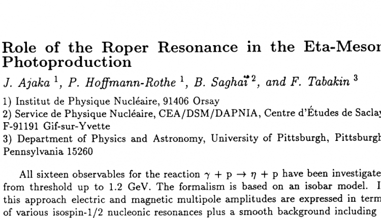 J Ajaka, F Tabakin, P Hoffmann-Rothe, B Saghai, 1995, Role of the Roper resonance in the eta-meson photoproduction, DAPNIA-SPHN-95-034, SCAN-9603118