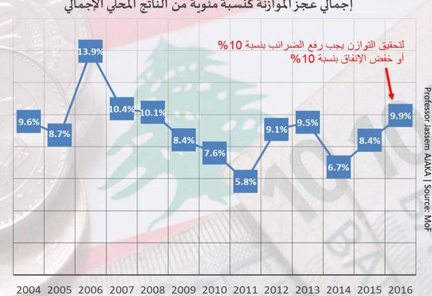 شكّل عجز الموازنة في العام 2004 ما يوازي 9.6% من الناتج المحلّي الإجمالي ليرتفع إلى 13.9% في العام 2006 مع عدوان تمّوز. النشاط الإقتصادي الذي أعقب عدوان تمّوز أدّى إلى خفض العجز إلى 5.8% في العام 2011، لكن الأزمة السورية وتداعياتها على الإقتصاد اللبناني كما وركود الإقتصاد العالمي، أدّى إلى رفع العجز إلى 9.5% في العام 2013 ليُعاود الإنخفاض في العام 2014 مع إنخفاض أسعار النفط العالمية. لكن الأعوام التي تلتّ رفعت العجز ليصل إلى حدود الـ 10 %!