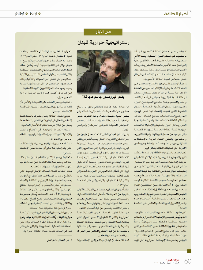 مقال البروفسور جاسم عجاقة في مجلة أسواق العرب – إستراتيجية حرارية للبنان – تاريخ تموز 2014