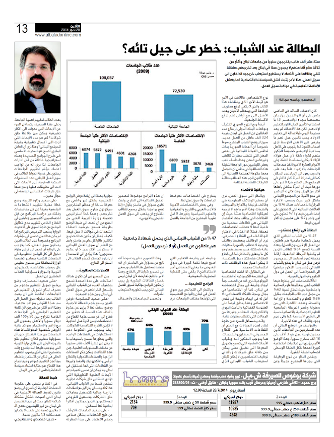 مقال البروفسور جاسم عجاقة في جريدة البلد – البطالة عند الشباب: خطر على جيل تائه؟ – تاريخ 28 تموز 2014